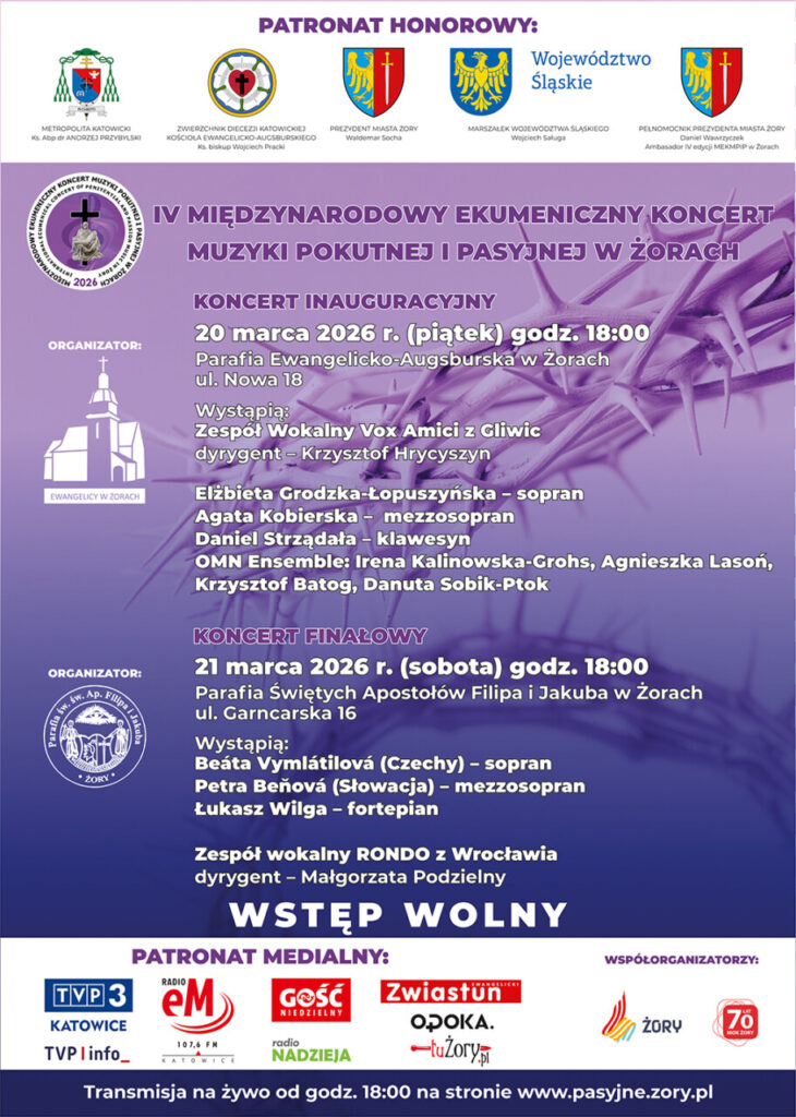 Honorowy patronat nad koncertem objęli: Abp. dr Andrzej Przybylski -Metropolita Katowicki, bp. Wojciech Pracki – Zwierzchnik Diecezji Katowickiej Kościoła Ewangelicko- Augsburskiego, Wojciech Saługa – Marszałek Województwa Śląskiego oraz Waldemar Socha – Prezydent Miasta Żory.